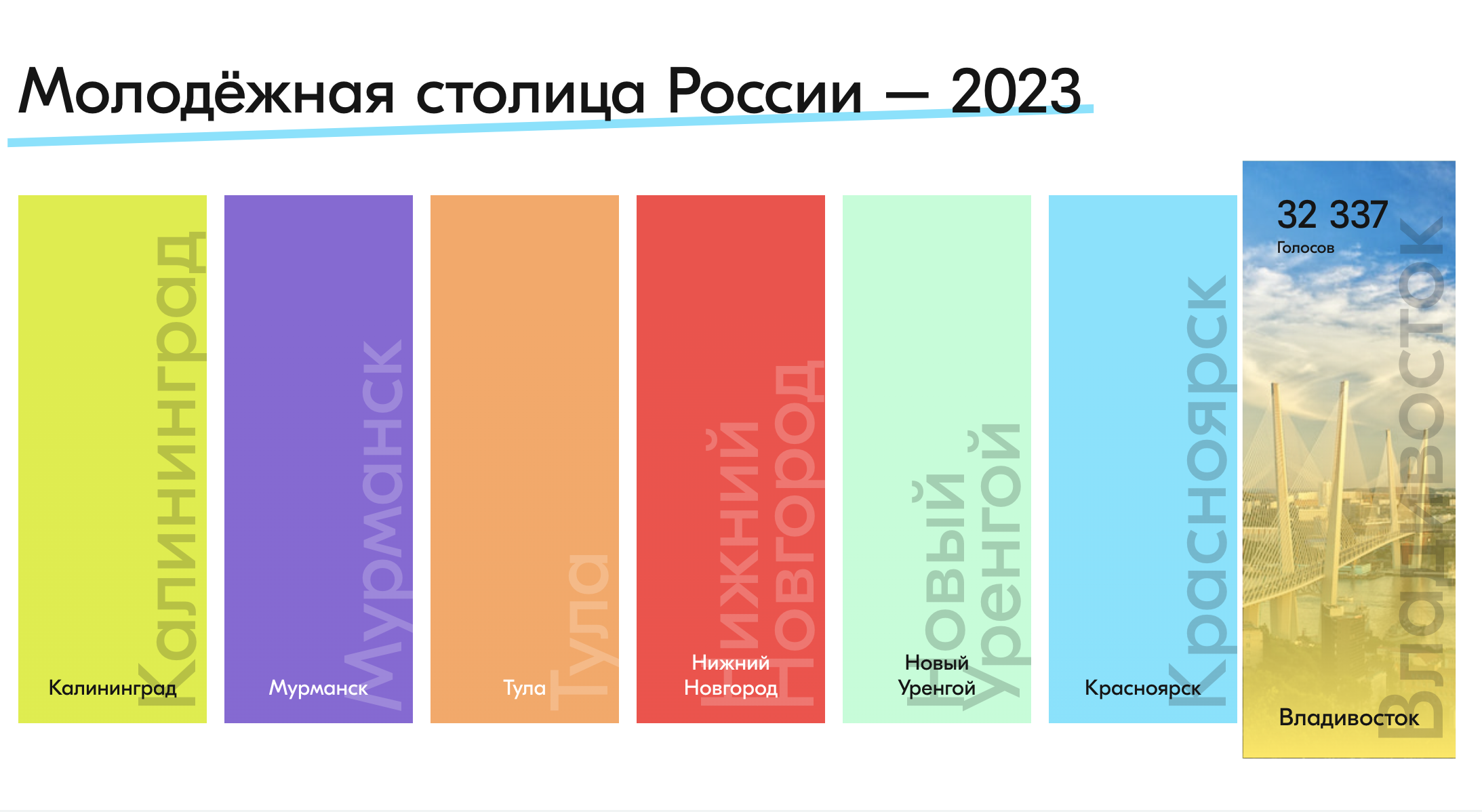 По результатам работы жюри в шорт-лист вошли 7 городов: Владивосток, Калининград, Красноярск, Нижний Новгород, Новый Уренгой, Мурманск и Тула.